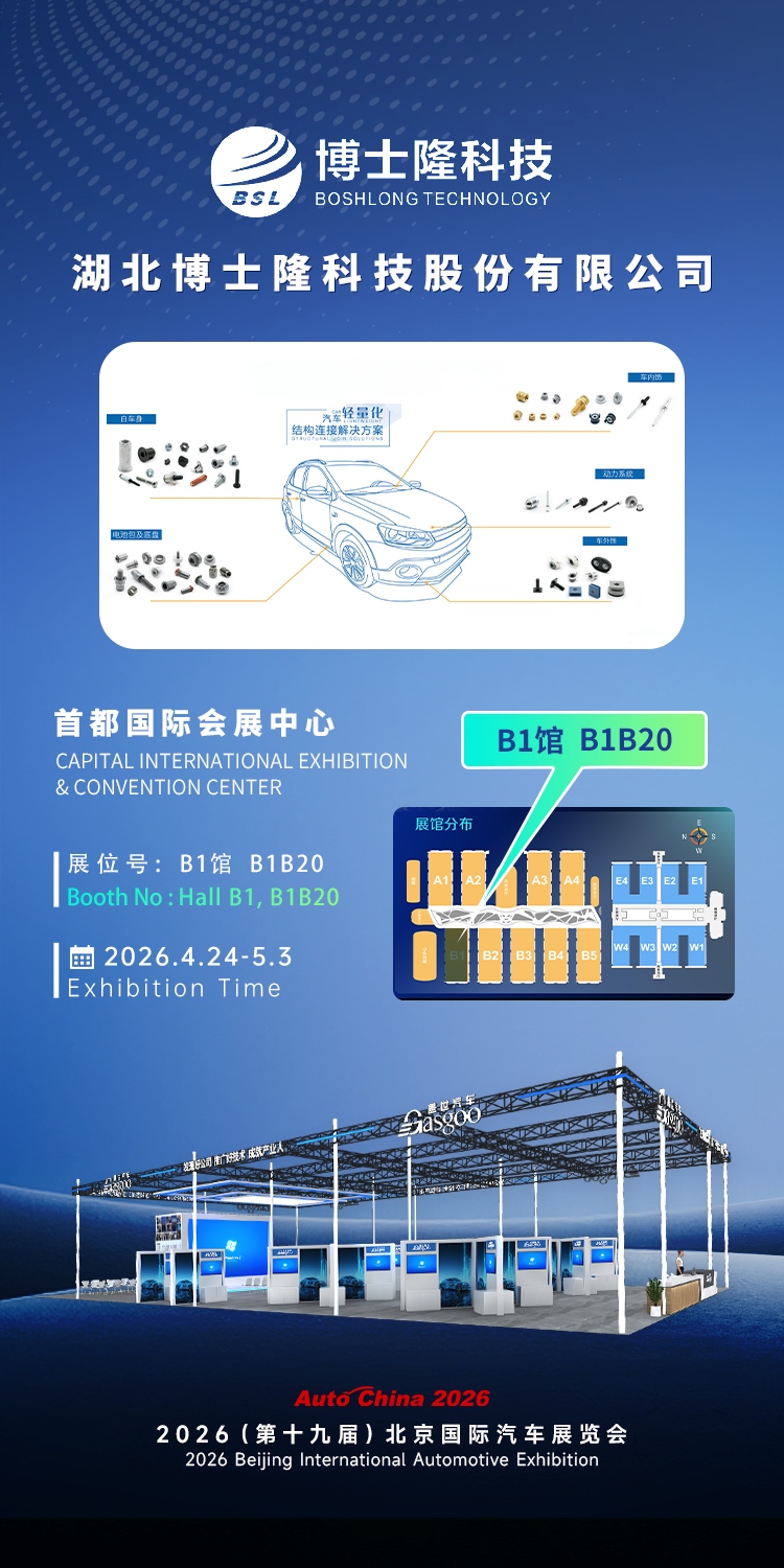 湖北博士隆科技股份有限公司创建于1990年,注册资本5530.7972万元,厂房面积3.1万多平方米,拥有设备450多台套,员工近353人,武汉研发中心设在武汉市高新技术开发区,研发团队人员超35人。公司通过了IATF16949、ISO14001、IOS45001等多体系管理认证,专业从事高端紧固铆接件与多材料连接技术产品的研发、生产、销售和服务,2022年被评为“国家级专精特新小巨人”企业。